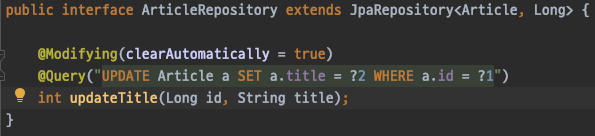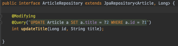 ArticleRepository를 만들었습니다. title을 UPDATE하는 쿼리 메서드를 정의했습니다.