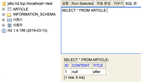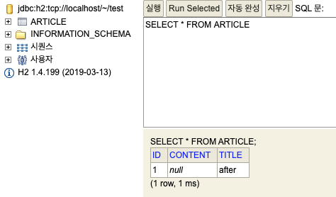 DB에도 예제 1과 동일하게 변경 된 값인 "after"가 들어가 있는 것을 확인할 수 있습니다.