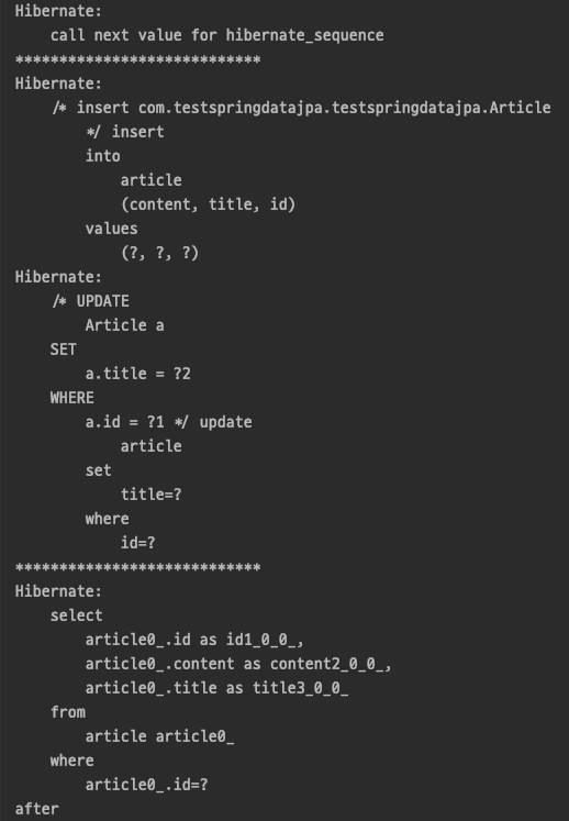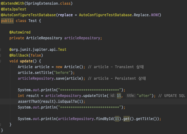 참고2) @DataJpaTest는 기본적으로 @Transactional을 포함하고 있습니다. 그래서 각 테스트 메서드를 실행할 때, 데이터를 RollBack 시키도록 되어 있습니다. 데이터가 RollBack이 된다면 실제 DB에서 Table을 확인할 수 없으므로 @RollBack(false)를 이용해 테스트 메서드가 끝나도 RollBack이 되지 않게 하였습니다. 또한 해당 코드에서는 벌크 연산 실행 시 flush를 하기 때문에 이전의 모든 쿼리가 실행되어 볼 수 있지만, Hibernate가 @DataJpaTest의 @Transactional의 RollBack을 인지하고, RollBack할 쿼리는 실행하지 않는 문제가 발생할 수 있습니다.